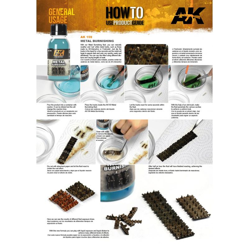 Una nuova formula più veloce (funziona in pochi secondi) e a un prezzo più competitivo. Abbiamo ampiamente testato e formulato e migliorato questo prodotto, qui ad AK-Interactive. Con il nostro fluido Metal Burnishing, puoi naturalmente rovinare e arrugginire i binari in metallo bianco, come quelli realizzati da Friulmodel o i nostri. Basta immergere i binari nel liquido per alcuni secondi e il metallo inizierà ad apparire scuro e arrugginito molto rapidamente, facilmente e senza sforzo. Puoi variare l'effetto usando diverse diluizioni e diverse lunghezze di ammollo. Utilizzando meno prodotto, puoi ottenere risultati ancora migliori rispetto alla nostra formula precedente.