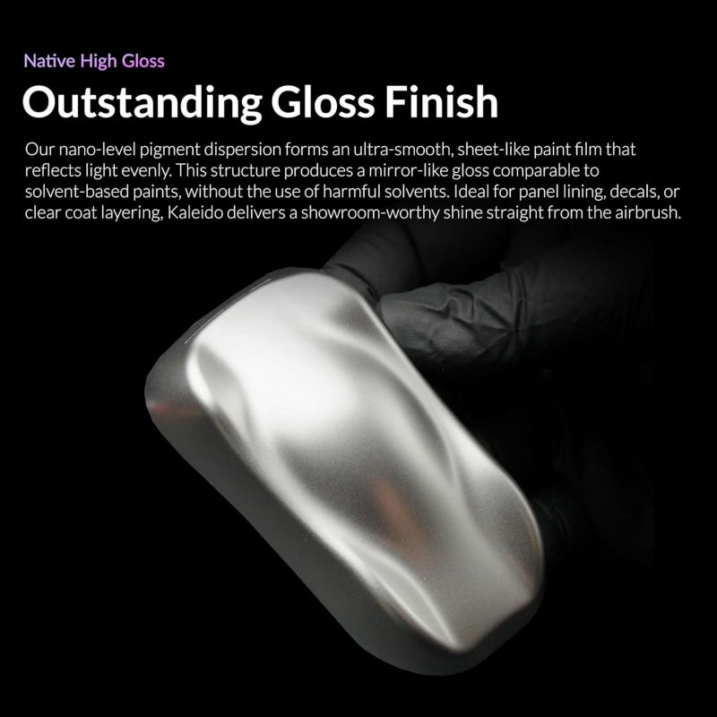 Le vernici Kaleido sono acriliche a base d'acqua pre-diluite, pronte all'uso direttamente dalla bottiglia con aerografi da 0,3-0,5 mm.