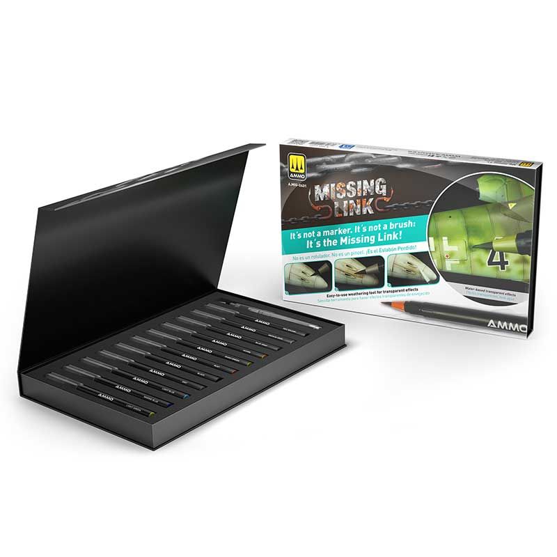 Il set Ammo Missing Link Aircraft introduce un nuovo livello di controllo e realismo nel modellismo aeronautico. Dotato di 12 pennarelli acquerellabili con punta a pennello specificamente formulati per effetti aeronautici, questo set consente ai modellisti di creare filtri, ombreggiature e effetti di invecchiamento direttamente sulle superfici verniciate. Ogni pennarello contiene un pigmento trasparente e idrosolubile che può essere facilmente sfumato o rimosso, offrendo un modo intuitivo e preciso per simulare l'usura operativa, le macchie di scarico e le sottili transizioni tonali sulle superfici degli aerei.